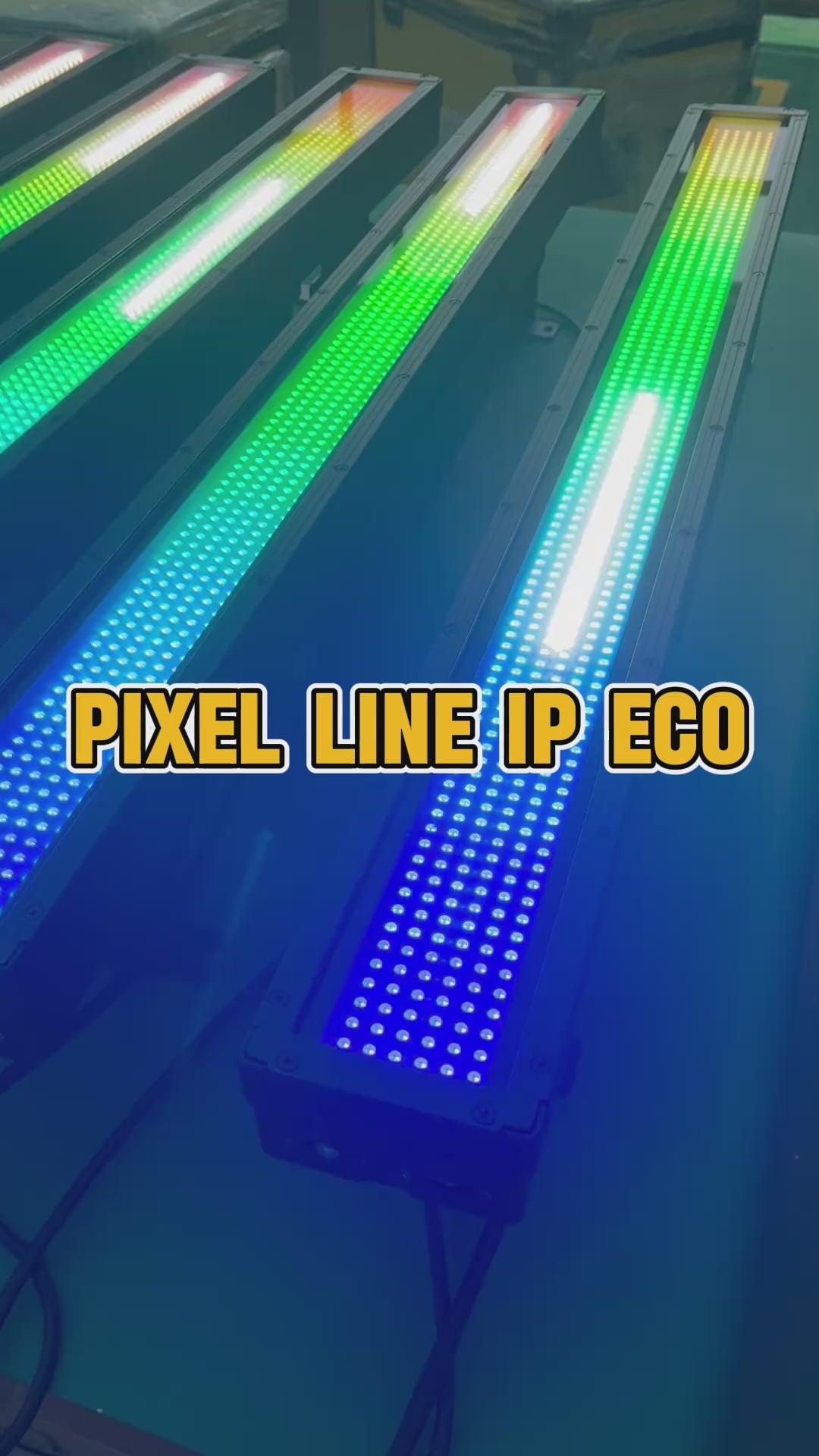 El Pixel Line IP ECO es una barra LED profesional IP66, equipada con 112×3W LED blanco y 672×0,5W LED RGB, con 36+12 zonas de control para efectos pixelados avanzados. Su consumo total es de 420 W y funciona entre 100–240 V AC a 50/60 Hz.